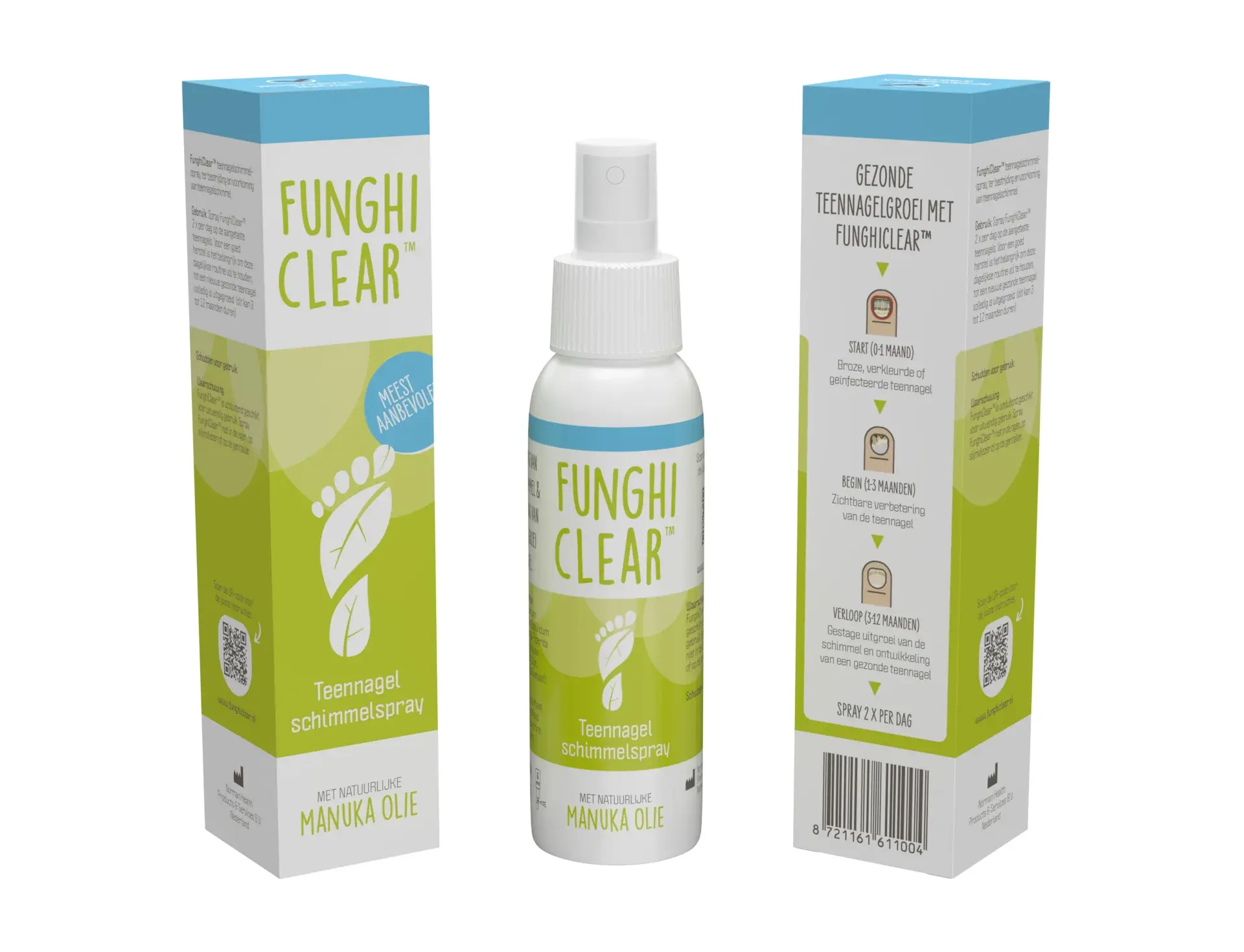 FunghiClear™ Anti-schimmel Spray is onze anti-schimmel spray voor de voeten met unieke eigenschappen en 100% natuurlijke actieve ingrediënten, zoals Manuka olie. FunghiClear™ Anti-schimmel Spray helpt om jouw voeten blij en gezond te maken door teennagelschimmel ("kalknagel"), voetschimmels en onychomycose te bestrijden en voorkomen. Uit onderzoek is gebleken dat FunghiClear™ bij regelmatig gebruik (minimaal 3 tot 4 maanden) tot de beste resultaten leidt.